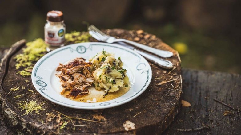 Trhané vepřové maso se šťouchaným bramborem a houbami