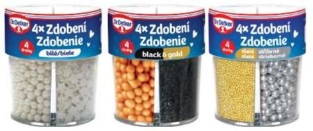 Společnost Dr. Oetker se postará o rozmanitost vašeho vánočního cukroví. Můžete použít například zdobení, které je k dispozici v několika variantách: bílé, zlaté a stříbrné nebo černé a zlaté. Varianta 4 × Zdobení black & gold Dr. Oetker umožní vytvořit mimořádně atraktivní dekorování. Praktická 4-dóza obsahuje 4 oddělené části se zdobením pro všestranné použití: černé perličky s měkkým středem, černé drobné kamínky, zlaté perličky s měkkým středem a zlaté drobné kuličky.