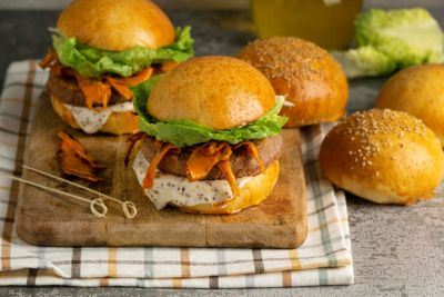 Naši dýňovou verzi si můžete připravit z pečené dýně rozmixované s cizrnou, parmezánem, vejcem a kořením, ze směsi vytvarovat placičky a ty dozlatova opéct. Podávejte je v housce se salátem, křupavou zeleninou a jemným dipem z polotučného tvarohu Tatra, citronové šťávy, česneku a čerstvých bylinek.