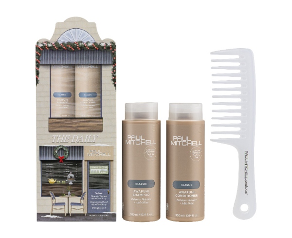 Rozverné balení sad Paul Mitchell ve stylu „village shop“ nabízí kombinace nejoblíbenějších produktů. Z řady setů jsme vybrali: Original Trio Awapuhi šampon a kondicionér s hřebenem zdarma. Paul Mitchell, 1238 Kč, eshop.paulmitchell.cz