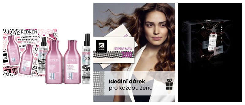 Kombinace některé z dárkových kazet pro krásné vlasy s voucherem (300 nebo 500 Kč) na službu v kterémkoli salonu Klier dopřeje obdarovanému komplexní péči. Pro pány jsme vybrali balíček STMNT (1199 Kč). Pro dámy sadu Redken Volume Injection (1100 Kč). Klier, Více na klier.cz, produkty na e-shopu Klier