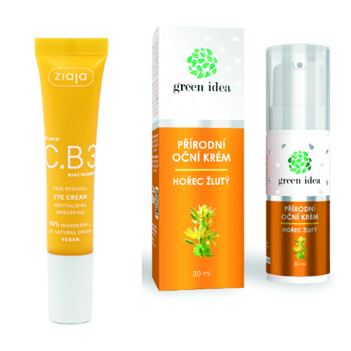 1. Krém pod oči cb3 niacinamide je bohatý na esence vitaminu C a B3 (niacinamid), jejichž koncentrace vykazuje víceúčelovou účinnost. Ziaja, 15 ml/129 Kč, více na ziajaprotebe.cz / 2. Přírodní oční krém Hořec žlutý je minimalistický, ale účinný spojenec pro každého, kdo chce dodat svému pohledu svěžest. Je tou pravou volbou pro všechny, kdo chtějí spojit funkční péči se zdravým životním stylem. Green Idea, 30 ml/298 Kč, více na greenidea.cz