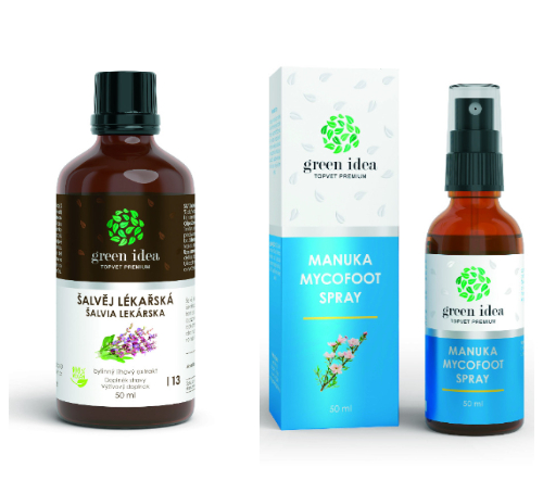 1.Manuka Mycofoot Spray obsahuje vysoké koncentrace účinných antimikrobiálních látek, manuky a australského čajovníku. Spray omezuje zápach nohou při zvýšené potivosti. Doporučuje se používat k hygieně nohou při mykózách.Green idea, 50 ml/228 Kč, v e-shopu www.greenidea.cz / 2. Šalvěj lékařská zabírá proti pocení, kromě toho příznivě ovlivňuje i psychiku, paměť či zažívání. Naším tipem je víceúčelový doplněk stravy Šalvěj lékařská tinktura – kapky.Green idea, 50 ml/128 Kč, v e-shopu www.greenidea.cz