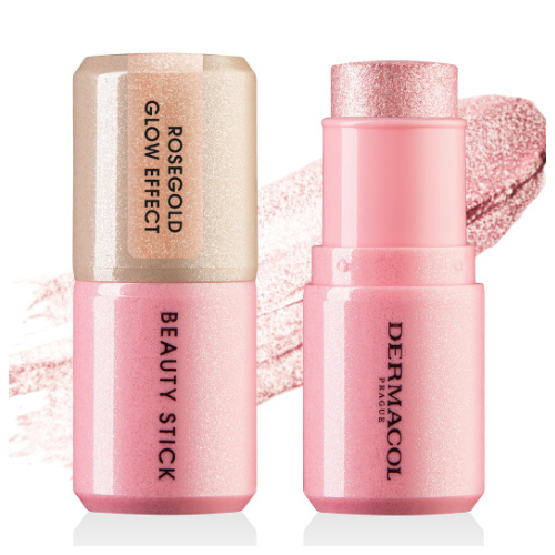Rozjasňovač v tyčince s diamantovým leskem Dermacol Beauty Stick pro obličej i tělo dodává pleti prozářený vzhled. Ve dvou odstínech – rose gold a gold diamond. Ve stejných růžových obalech najdete i konturovací tyčinky a make-up. Dermacol, 199 Kč