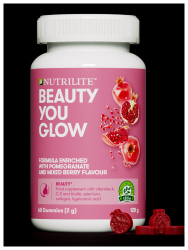 Růžová barva přitahuje pozornost i k doplňku stravy Beauty You Glow Nutrilite™. Kombinace vnitřní výživy a cílené péče v želé tabletách s příchutí lesního ovoce podporuje zdravý vzhled pokožky, vlasů i nehtů. Složení kombinuje vitaminy A, C a E, biotin a selen, nechybí kyselina hyaluronová, kolagen a extrakt z granátového jablka. Artistry, 60 tblt / 830 Kč, prodej amway.cz