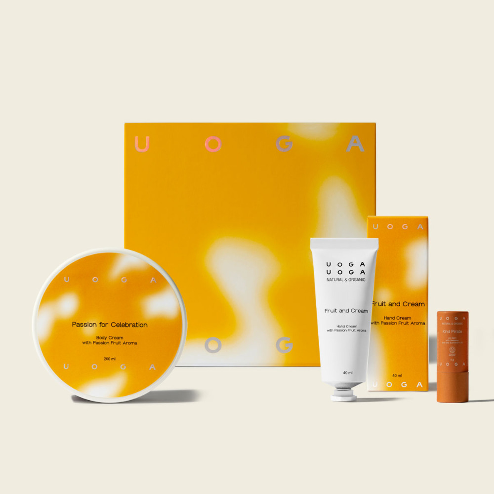 Vánoční dárková kolekce péče o tělo s mučenkou Orange set obsahuje tělový krém, krém na ruce a balzám na rty. UOGA UOGA, 895 Kč, www.biobay.cz