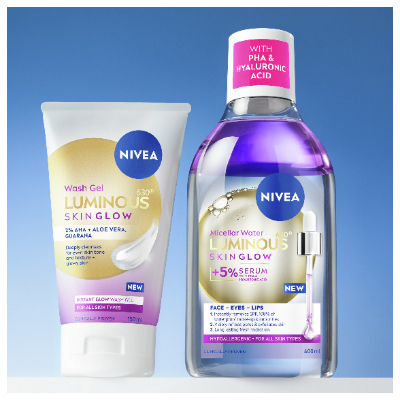 Čisticí pleťový gel Luminous630 Skin Glow a micelární voda ze stejné řady přispějí k tomu, že vaše pleť bude opravdu zářit. Nivea, čisticí gel 210 Kč, micelární voda 280 Kč